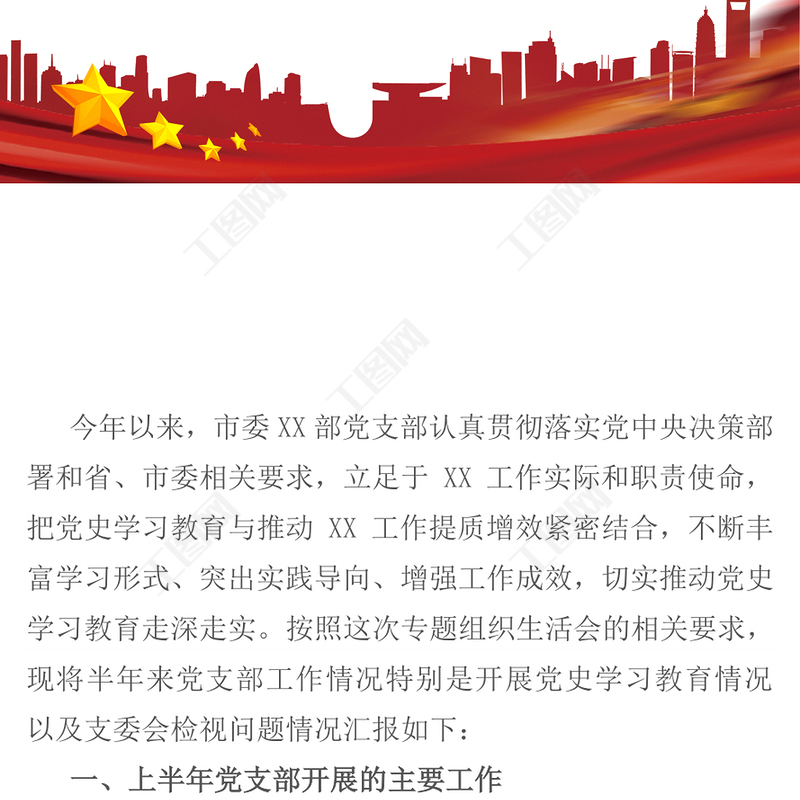 工圖網(wǎng)提供市直機(jī)關(guān)黨史學(xué)習(xí)教育專題組織生活會(huì)黨支部半年工作總結(jié)及檢視剖析材料供會(huì)員免費(fèi)下載。更多精彩黨課PPT素材,盡在工圖網(wǎng)。
