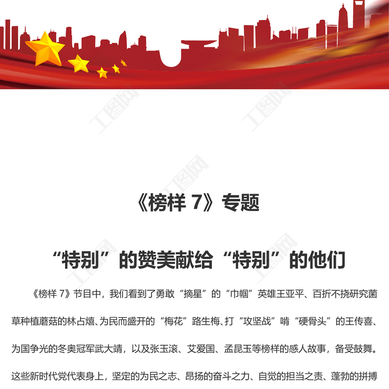 工圖網(wǎng)提供《榜樣7》專題 “特別”的贊美獻給“特別”的他們供會員免費下載。更多精彩黨課PPT素材,盡在工圖網(wǎng)。