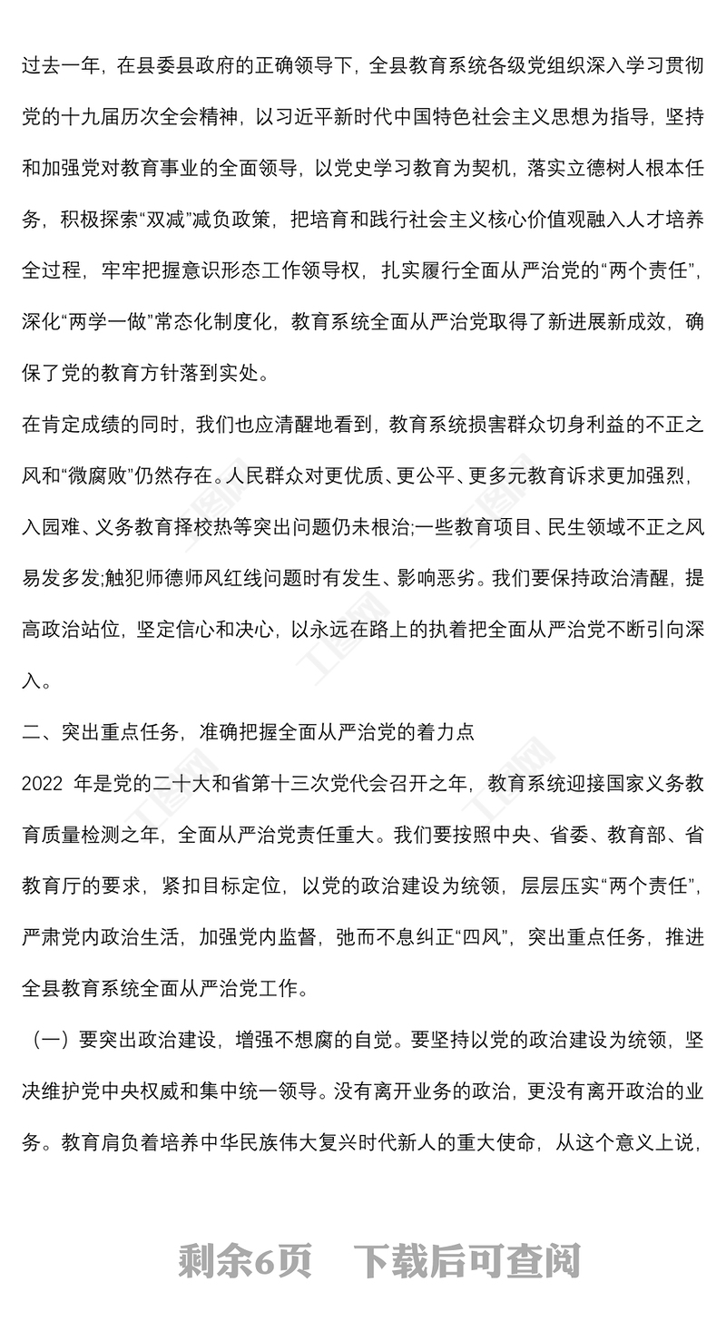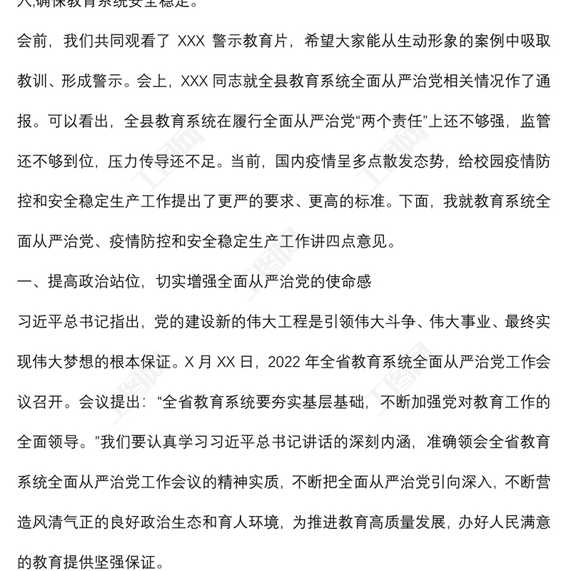 工圖網(wǎng)提供在全縣教育系統(tǒng)全面從嚴(yán)治黨暨疫情防控和安全穩(wěn)定生產(chǎn)工作會(huì)議上的講話供會(huì)員免費(fèi)下載。更多精彩黨課PPT素材,盡在工圖網(wǎng)。