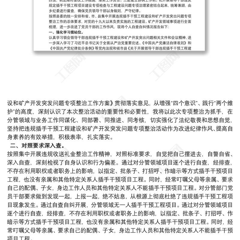工圖網(wǎng)提供個人違規(guī)插手干預(yù)工程建設(shè)突出問題專項整治自查自糾情況報告三篇供會員免費(fèi)下載。更多精彩黨課PPT素材,盡在工圖網(wǎng)。