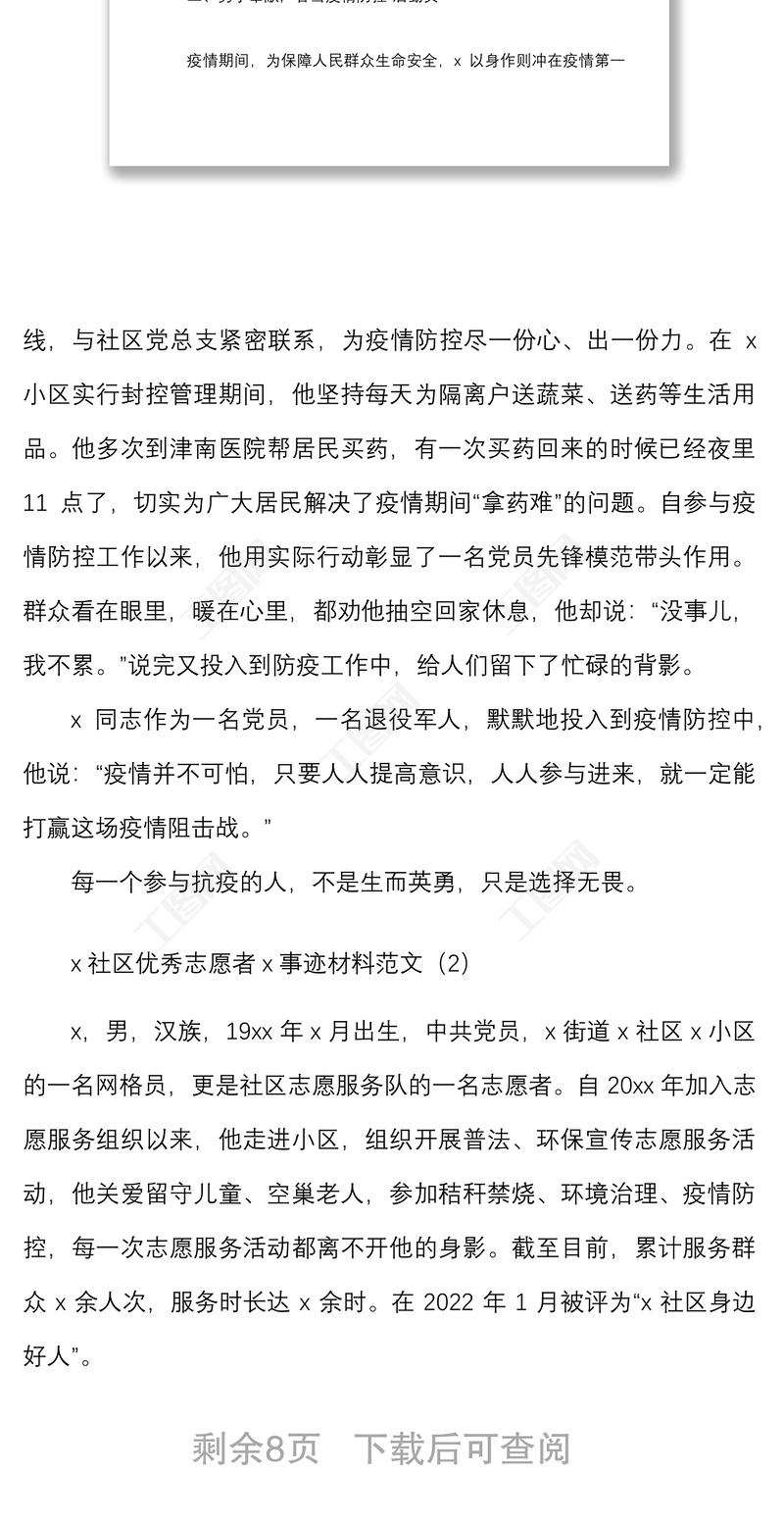 工圖網(wǎng)提供5篇最美社區(qū)志愿者個(gè)人事跡材料范文5篇含疫情防控個(gè)人先進(jìn)事跡供會(huì)員免費(fèi)下載。更多精彩黨課PPT素材,盡在工圖網(wǎng)。