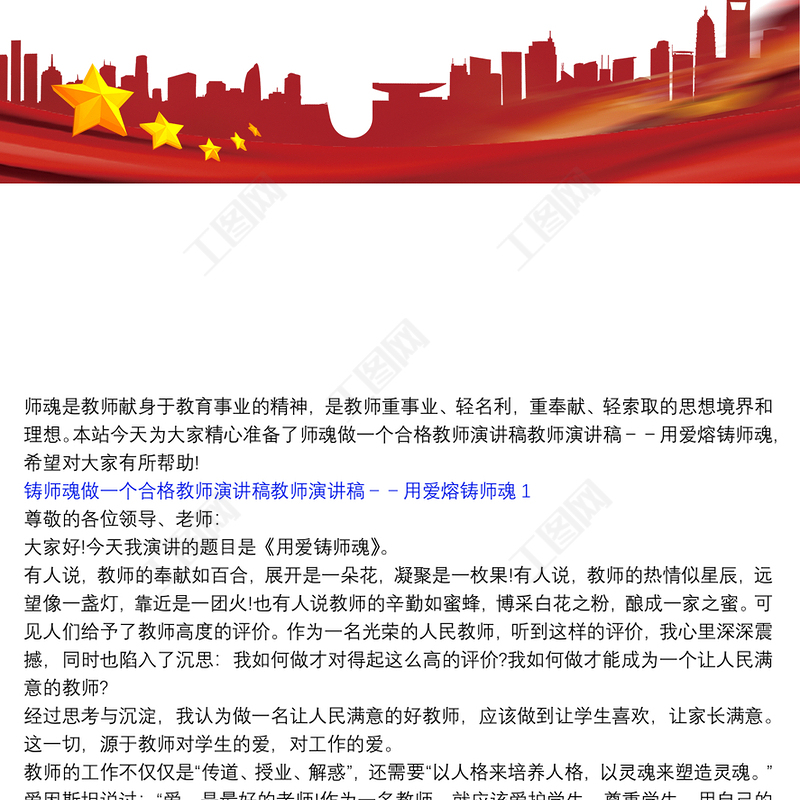 工圖網(wǎng)提供鑄師魂做一個(gè)合格教師演講稿教師演講稿--用愛熔鑄師魂3篇供會(huì)員免費(fèi)下載。更多精彩黨課PPT素材,盡在工圖網(wǎng)。