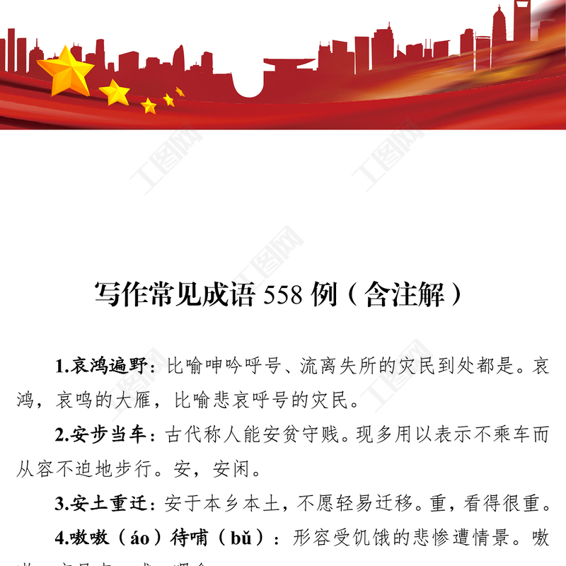 工圖網(wǎng)提供寫(xiě)作常見(jiàn)成語(yǔ)558例(含注解)供會(huì)員免費(fèi)下載。更多精彩黨課PPT素材,盡在工圖網(wǎng)。
