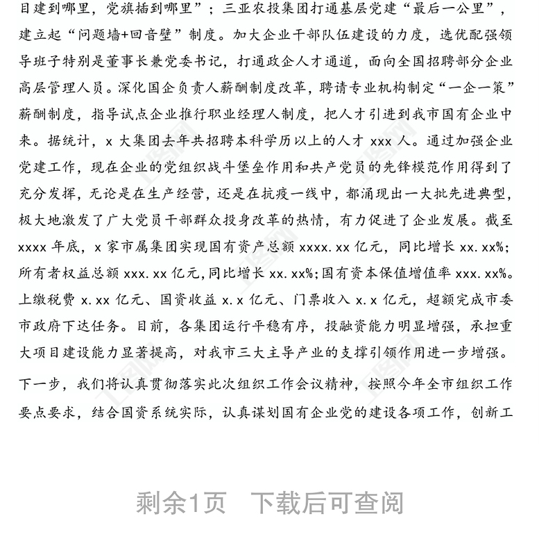 2022學(xué)習(xí)國(guó)企改革發(fā)展和黨的建設(shè)重要論述及重要指示批示精神的感想和心得體會(huì)國(guó)有企業(yè)2022年黨建工作思路2022關(guān)于國(guó)有企業(yè)改革發(fā)展和黨的建設(shè)重要論述精神心得提綱2022黨建引領(lǐng)信用村建設(shè)發(fā)言材料2021黨建引領(lǐng)提質(zhì)增效金句發(fā)言材料2021黨建引領(lǐng)退役軍人事務(wù)工作亮點(diǎn)發(fā)言材料2021黨課國(guó)企改革發(fā)展和黨的建設(shè)的重要論述2021提高政治站位加強(qiáng)黨建引領(lǐng)發(fā)言材料2021國(guó)有企業(yè)黨員黨史學(xué)習(xí)心得2021關(guān)于國(guó)有企業(yè)改革發(fā)展和黨的建設(shè)發(fā)言材料國(guó)有企業(yè)支部書記黨課講稿2021專題黨課2021黨課 學(xué)黨史 國(guó)有企業(yè)2021黨建引領(lǐng)信用村試點(diǎn)發(fā)言材料2021國(guó)有企業(yè)關(guān)于黨的十九演講稿2022學(xué)習(xí)關(guān)于國(guó)有企業(yè)改革發(fā)展和黨的建設(shè)心得體會(huì)