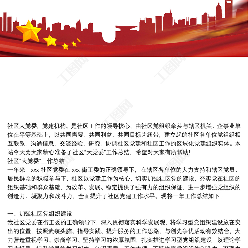 工圖網(wǎng)提供社區(qū)“大黨委”工作總結(jié)2021三篇供會員免費下載。更多精彩黨課PPT素材,盡在工圖網(wǎng)。