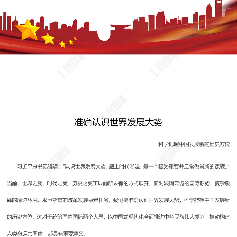 工圖網(wǎng)提供2023正確認識世界發(fā)展大勢跟上時代潮流 ppt精美黨政風科學把握中國發(fā)展新的歷史方位黨組織黨群黨員學習培訓黨課課件(講稿)供會員免費下載。更多精彩黨課PPT素材,盡在工圖網(wǎng)。