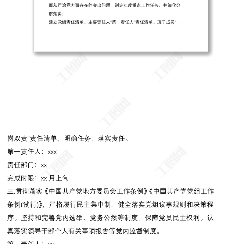 工圖網(wǎng)提供2021落實(shí)全面從嚴(yán)治黨主體責(zé)任任務(wù)分工及責(zé)任清單供會(huì)員免費(fèi)下載。更多精彩黨課PPT素材,盡在工圖網(wǎng)。