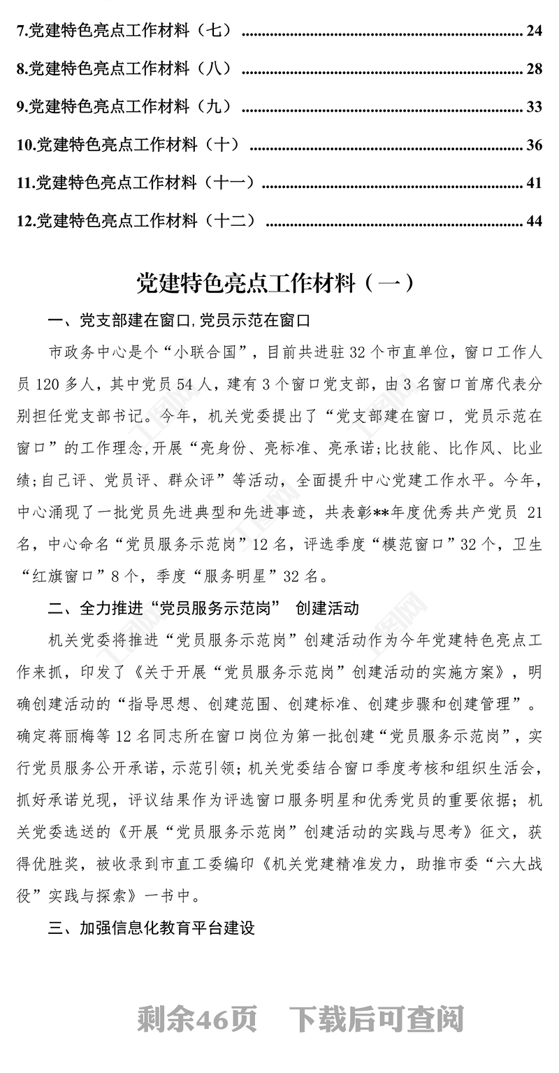 黨建特色工作材料匯編(12篇)黨課材料,黨課材料,公文范例,領(lǐng)導(dǎo)述職報(bào)告,機(jī)關(guān)公文寫作 Array