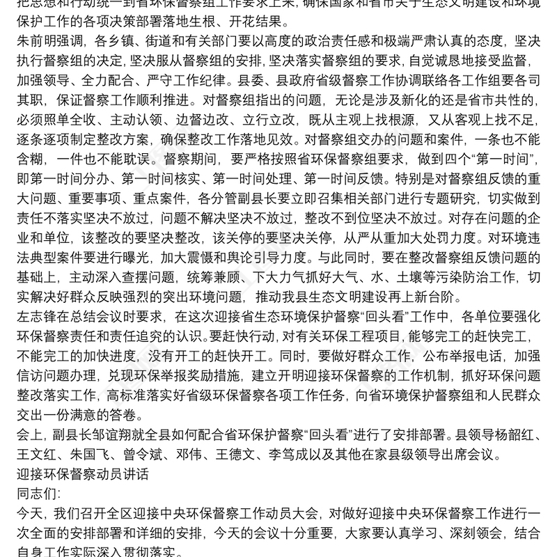 在生態(tài)環(huán)境保護督察迎檢工作動員會上的講話包含