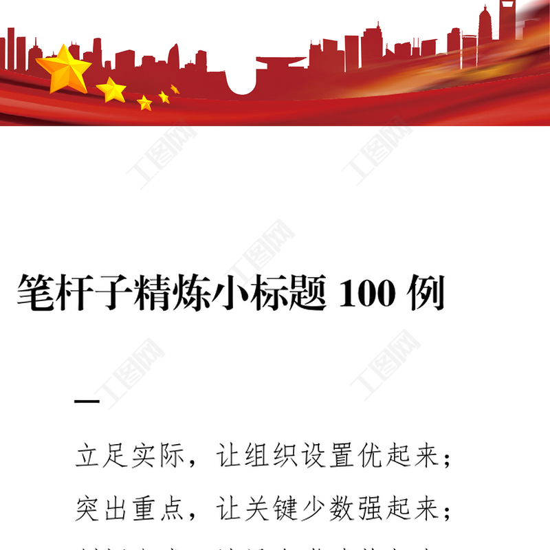 工圖網(wǎng)提供筆桿子精煉小標(biāo)題100例供會員免費(fèi)下載。更多精彩黨課PPT素材,盡在工圖網(wǎng)。
