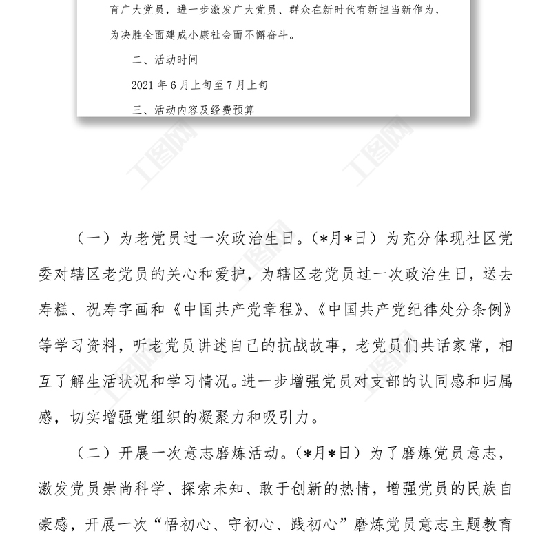 工圖網(wǎng)提供社區(qū)慶祝建黨100周年系列活動(dòng)方案供會(huì)員免費(fèi)下載。更多精彩黨課PPT素材,盡在工圖網(wǎng)。