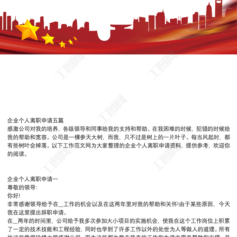 工圖網(wǎng)提供企業(yè)個(gè)人離職申請(qǐng)【5篇】供會(huì)員免費(fèi)下載。更多精彩黨課PPT素材,盡在工圖網(wǎng)。