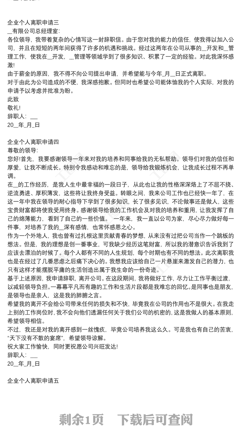 企業(yè)個(gè)人離職申請(qǐng)【5篇】