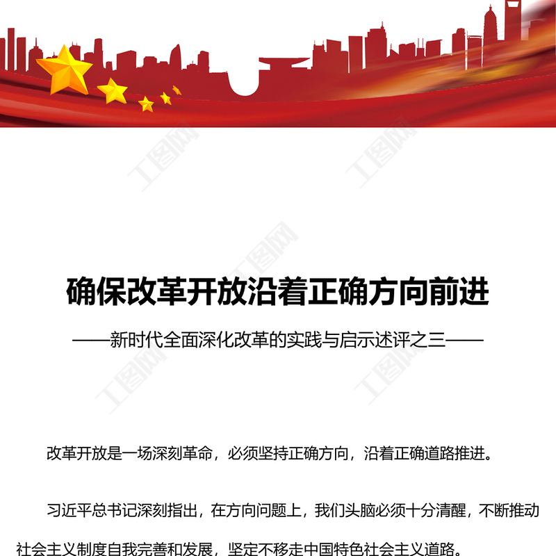 工圖網(wǎng)提供確保改革開放沿著正確方向前進(jìn)PPT紅色大氣新時代全面深化改革的實(shí)踐與啟示述評之三(講稿)供會員免費(fèi)下載。更多精彩黨課PPT素材,盡在工圖網(wǎng)。