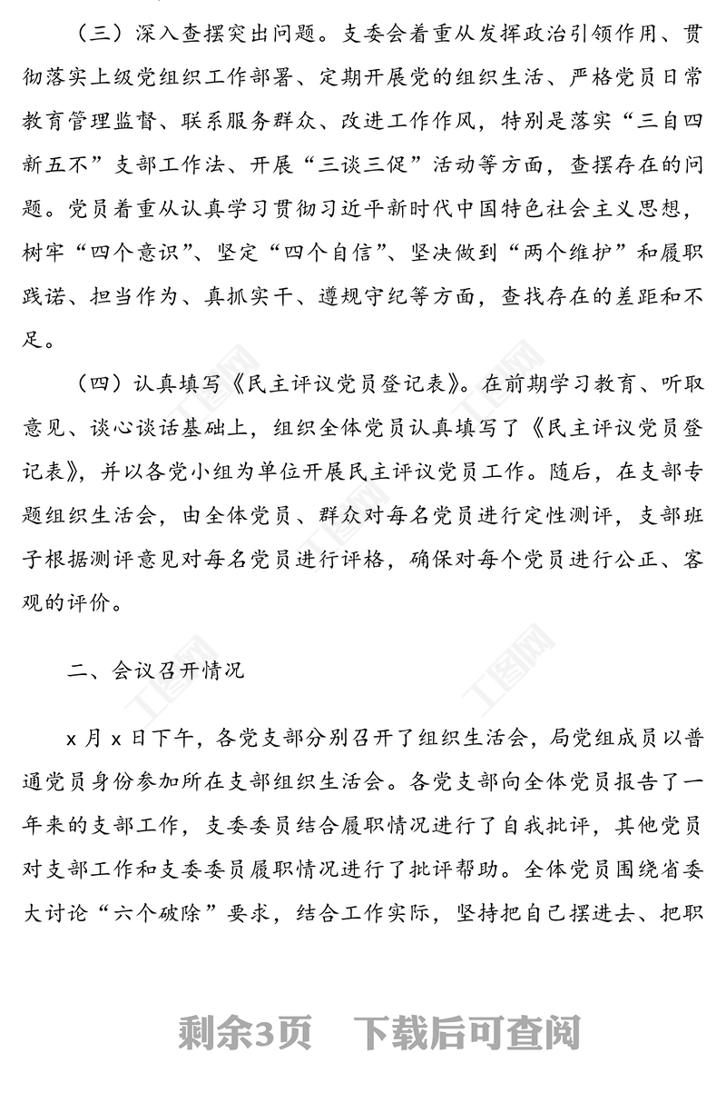 工圖網(wǎng)提供2021年黨委各黨支部組織生活會(huì)和民主評(píng)議黨員情況報(bào)告范文(1)供會(huì)員免費(fèi)下載。更多精彩黨課PPT素材,盡在工圖網(wǎng)。
