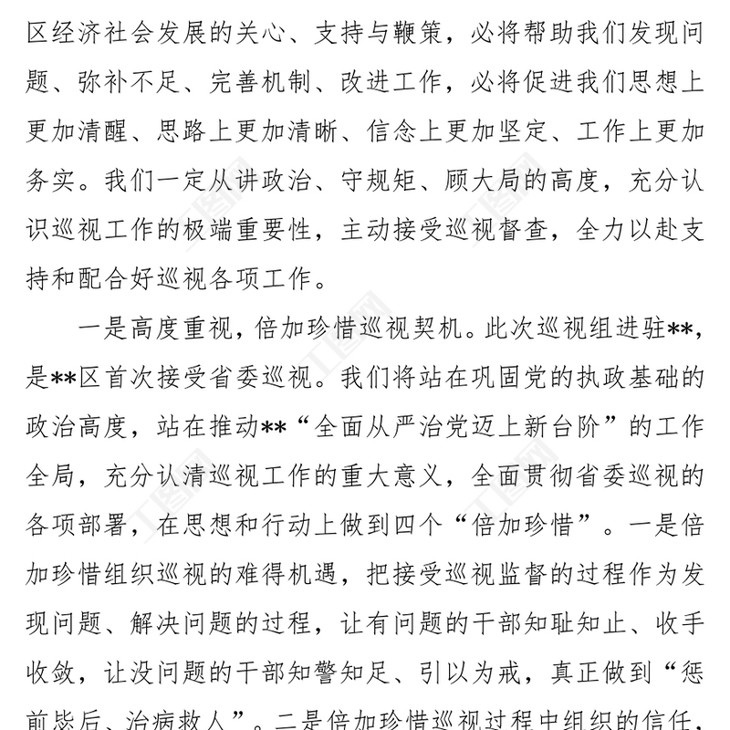 區(qū)委書記在省委巡視**區(qū)工作動員會上的表態(tài)發(fā)言