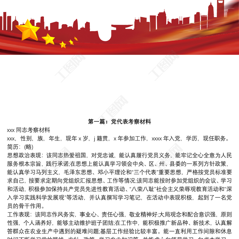 工圖網(wǎng)提供黨代表候選人考察材料_黨代表考察材料供會員免費下載。更多精彩黨課PPT素材,盡在工圖網(wǎng)。