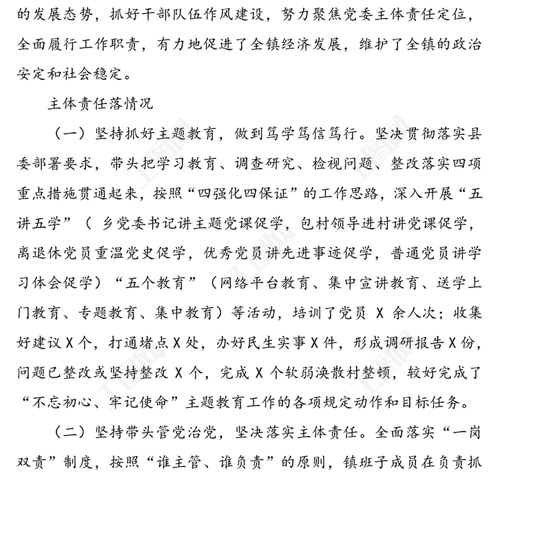 堅(jiān)定政治本色,踐行忠誠(chéng)擔(dān)當(dāng)推動(dòng)全面從嚴(yán)治黨向縱深推進(jìn)—XX鎮(zhèn)落實(shí)全面從嚴(yán)治黨主體責(zé)任報(bào)告,全面從嚴(yán)治黨,公文范例,領(lǐng)導(dǎo)述職報(bào)告,機(jī)關(guān)公文寫(xiě)作 Array