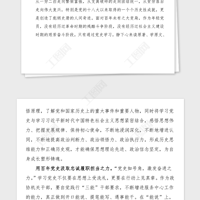 工圖網(wǎng)提供黨史心得政協(xié)機(jī)關(guān)干部黨史學(xué)習(xí)教育心得體會(huì)范文學(xué)好黨史必修課開啟奮斗新征程研討發(fā)言材料參考供會(huì)員免費(fèi)下載。更多精彩黨課PPT素材,盡在工圖網(wǎng)。