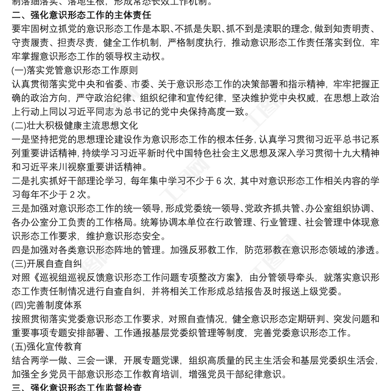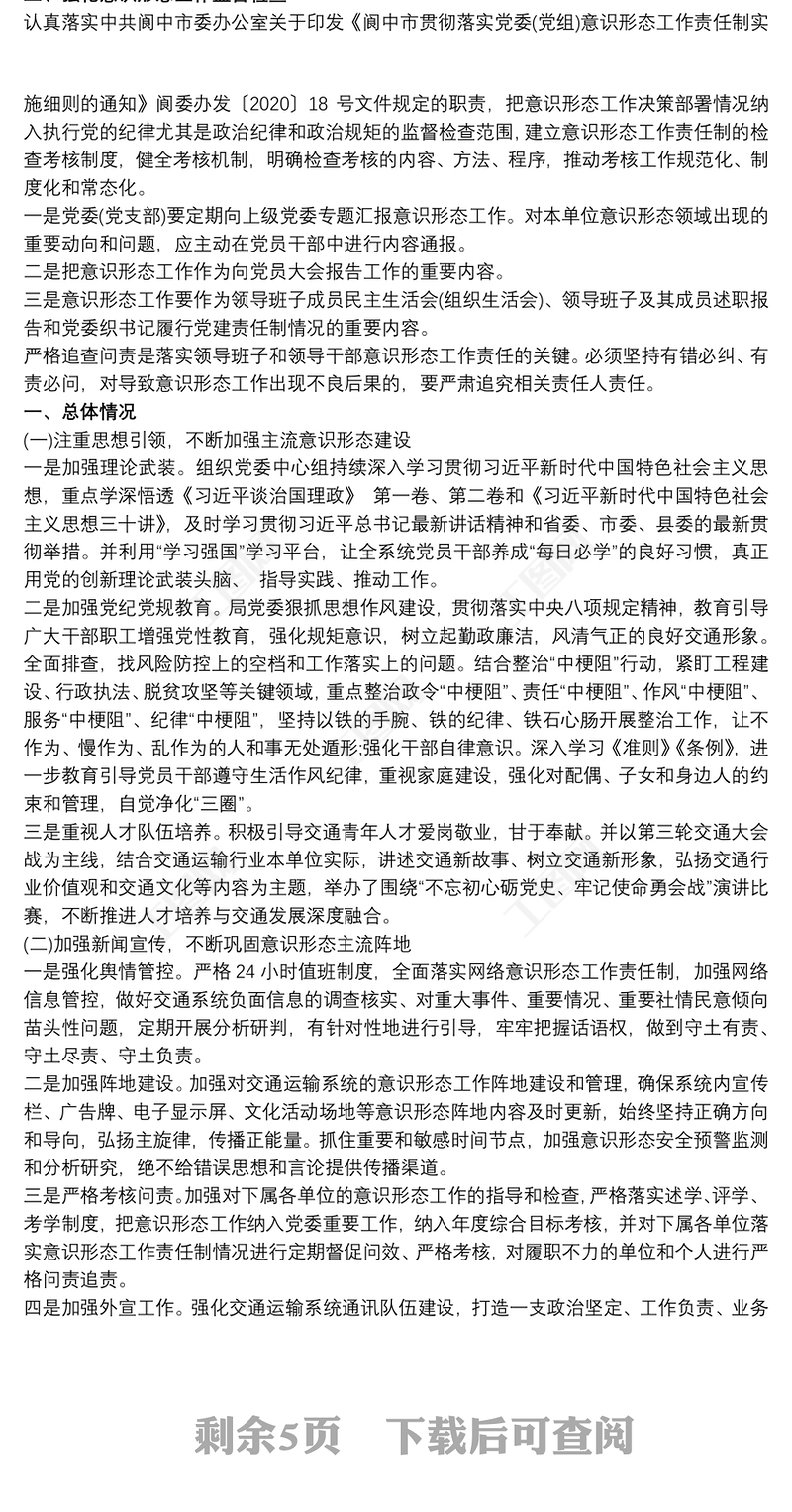2021黨支部書記意識形態(tài)工作述職報告2022黨員領(lǐng)導(dǎo)干部網(wǎng)絡(luò)意識形態(tài)工作教育培訓(xùn)工作方案2021黨委黨組網(wǎng)絡(luò)意識形態(tài)工作責(zé)任實施細則全文專題研究意識形態(tài)工作會議記錄2021意識形態(tài)工作組織生活會材料2021網(wǎng)絡(luò)意識形態(tài)工作分析研判報告2022黨支部年度意識形態(tài)工作報告2022意識形態(tài)工作巡察重點及注意事項公安意識形態(tài)工作計劃2021統(tǒng)戰(zhàn)部工作意識形態(tài)發(fā)言2022綜治維穩(wěn)意識形態(tài)工作匯報2022黨風(fēng)廉政建設(shè)及意識形態(tài)工作情況匯報編辦意識形態(tài)工作整改2021二級學(xué)院意識形態(tài)工作自查報告2022年第二季度意識形態(tài)工作報告