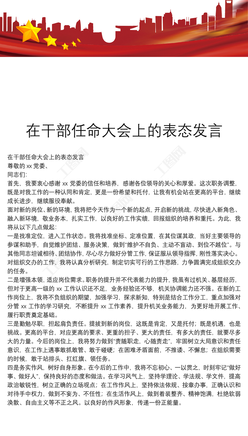 工圖網(wǎng)提供在干部任命大會(huì)上的表態(tài)發(fā)言供會(huì)員免費(fèi)下載。更多精彩黨課PPT素材,盡在工圖網(wǎng)。
