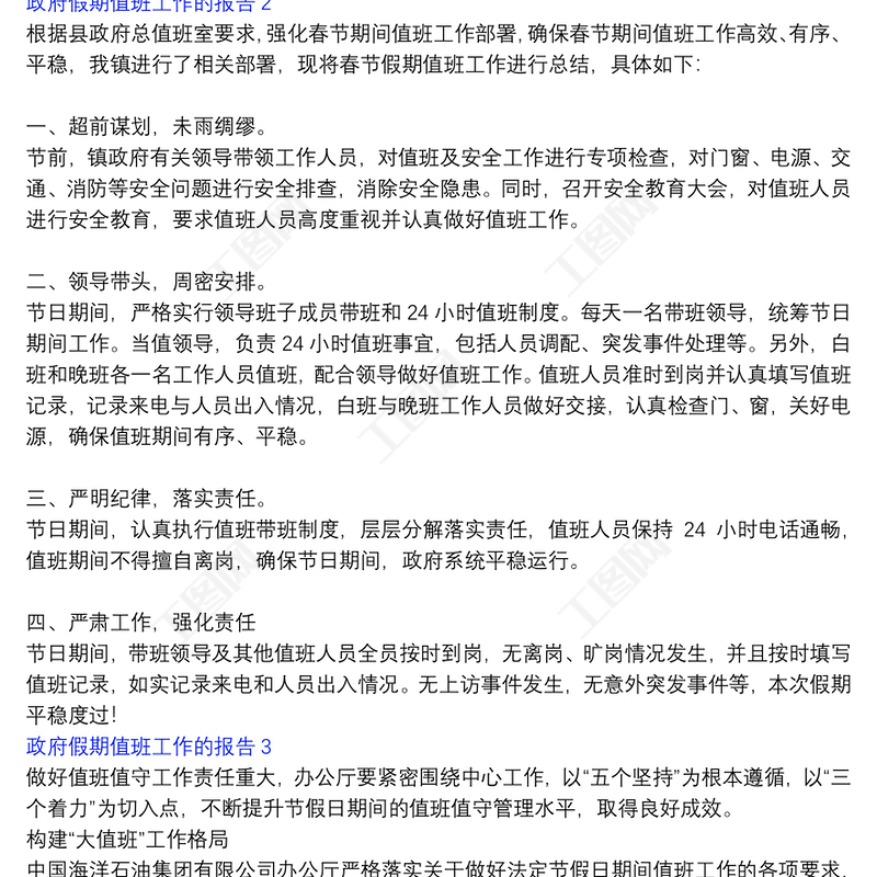 工圖網(wǎng)提供政府假期值班工作的報(bào)告三篇供會(huì)員免費(fèi)下載。更多精彩黨課PPT素材,盡在工圖網(wǎng)。